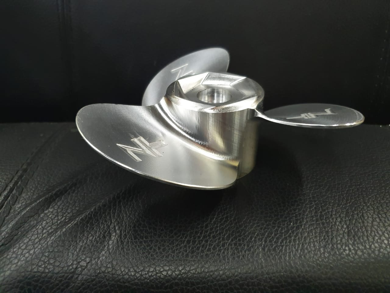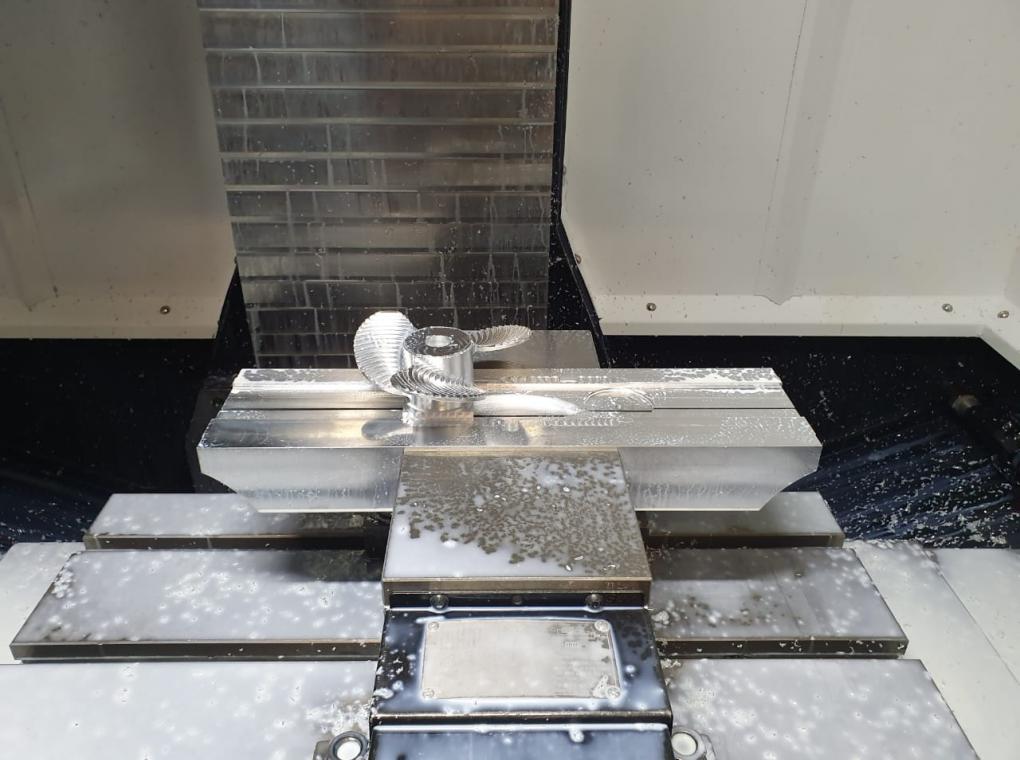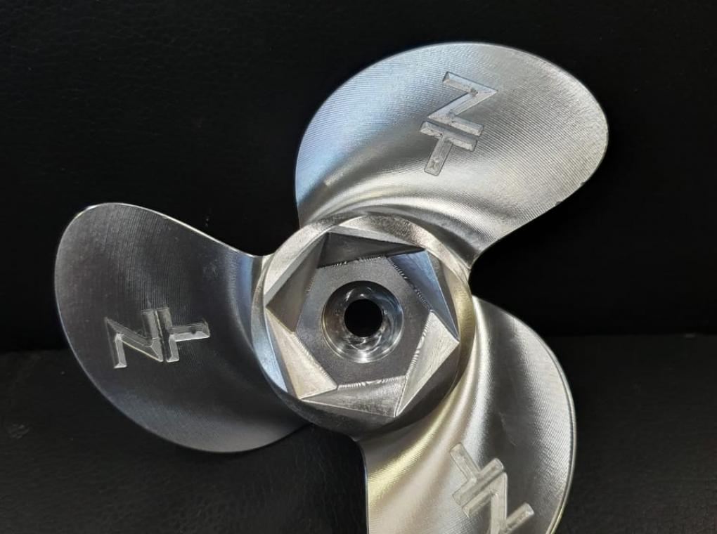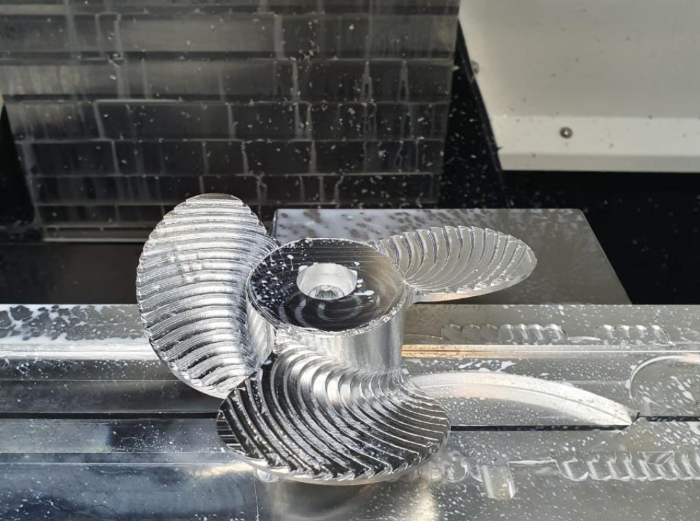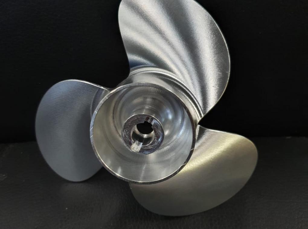 Гребной винт, для прототипа лифтфойла. Это специальная моторизованная доска для водного спорта и отдыха. В отличие от мото-серфинга, лифтфойл не касается воды всей плоскостью доски, а как бы парит над водой. При этом держат и толкают доску специальный подводный плавник и установленный на нём мотор с винтом. Как раз этот металлический винт мы и фрезеровали на нашем производстве. Соответственно, винт выполнен из цельно-фрезерованного алюминия.
