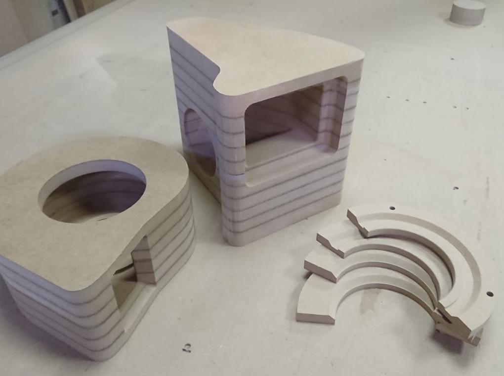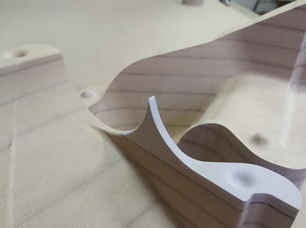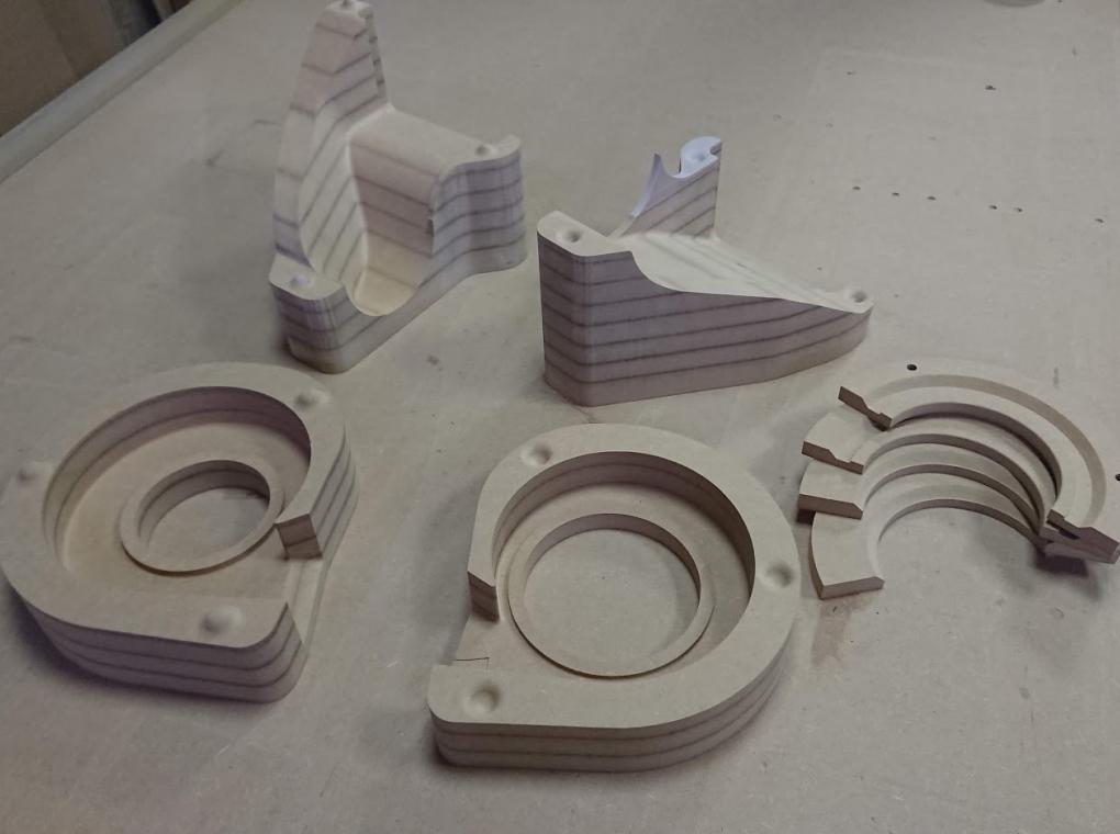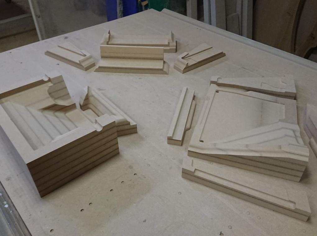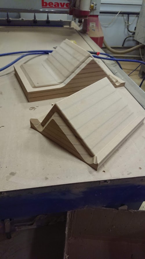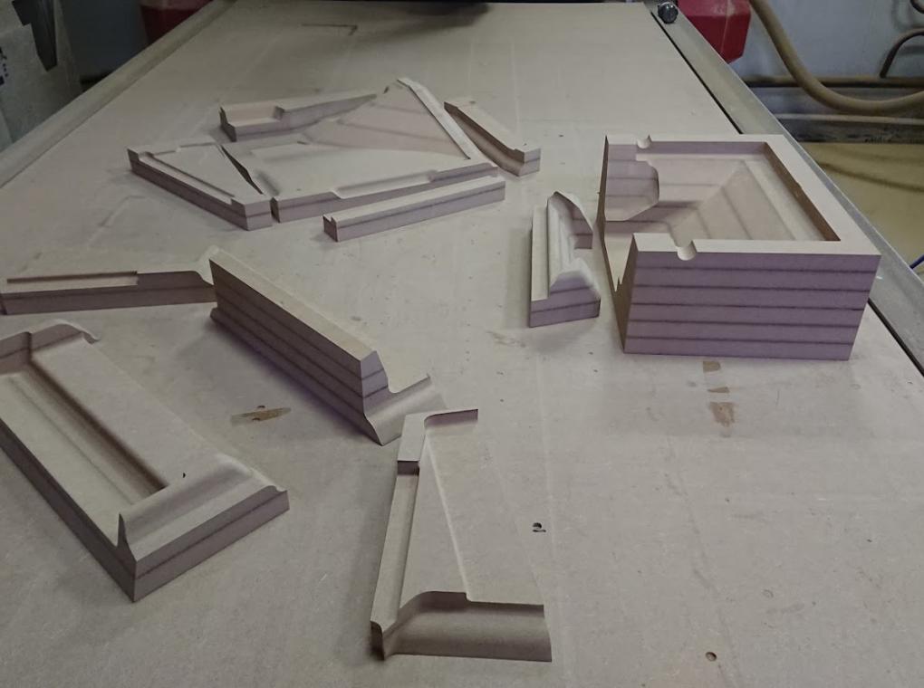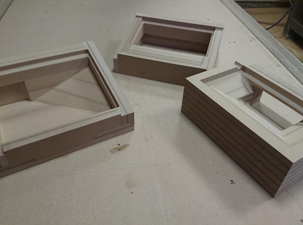 Матрицы были отфрезерованы и собраны из МДФ. Интересная особенность проекта: часть одной из форм пришлось сделать из модельного пластика, поскольку форма была слишком тонкой и при таких размерах МДФ бы не выдержал нагрузки при формовке (и разрушился бы).