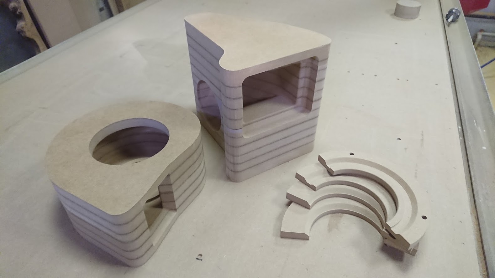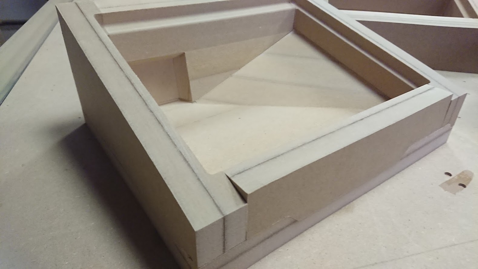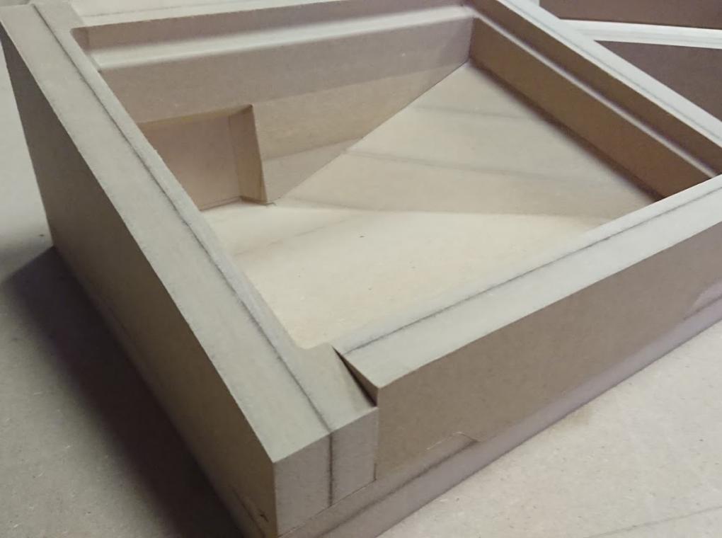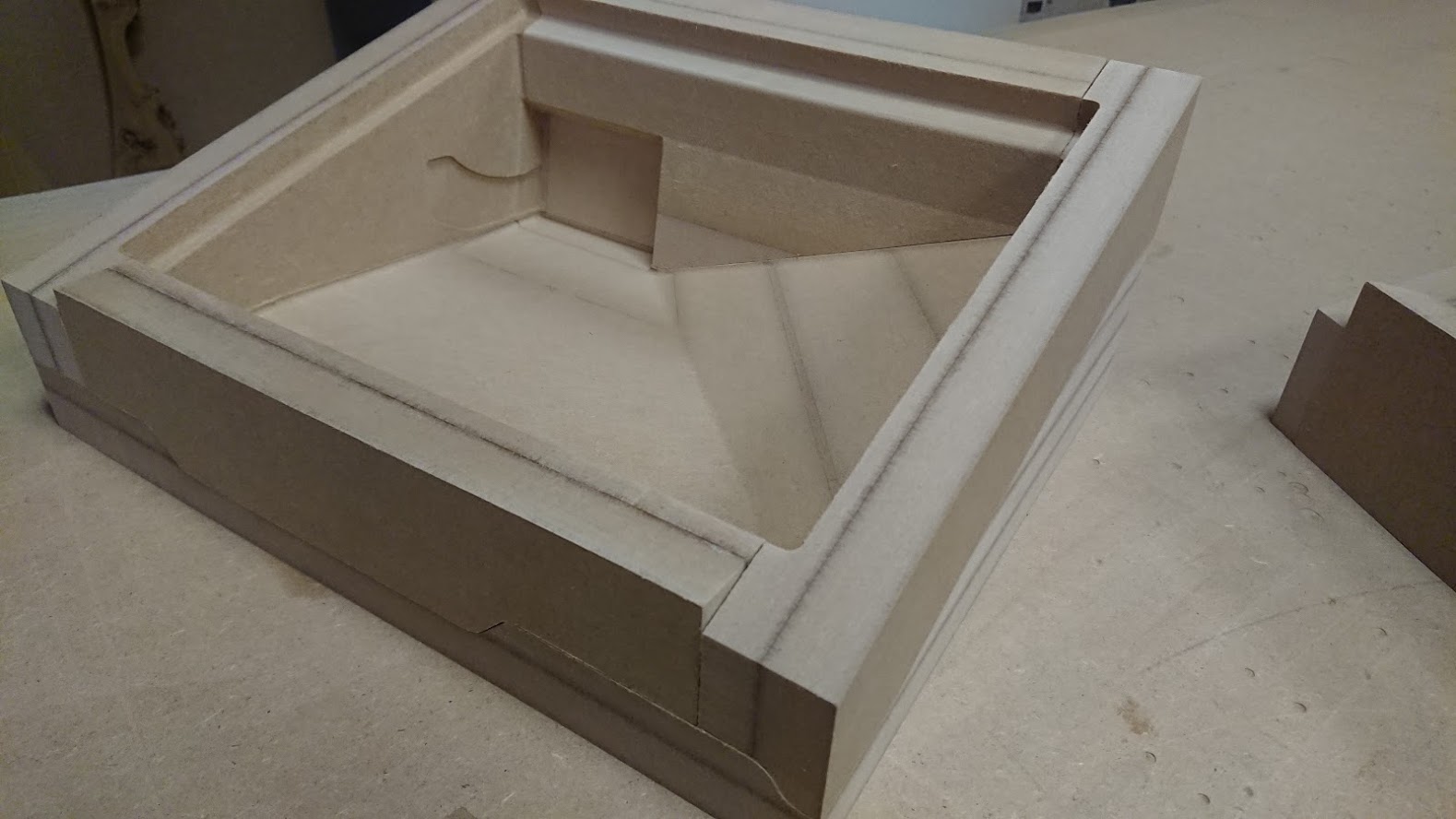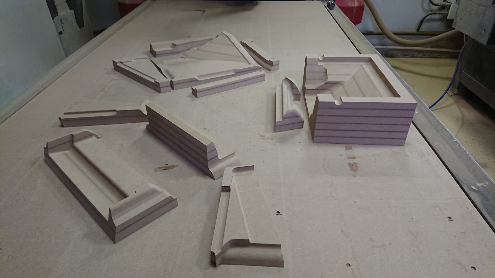 Матрицы были отфрезерованы и собраны из МДФ. Интересная особенность проекта: часть одной из форм пришлось сделать из модельного пластика, поскольку форма была слишком тонкой и при таких размерах МДФ бы не выдержал нагрузки при формовке (и разрушился бы).